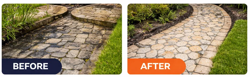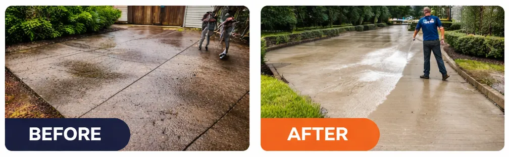 From oil stains to moss and dirt buildup, our surface cleaning restores concrete including driveways, sidewalks, curbs, patios, and garage aprons.